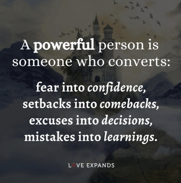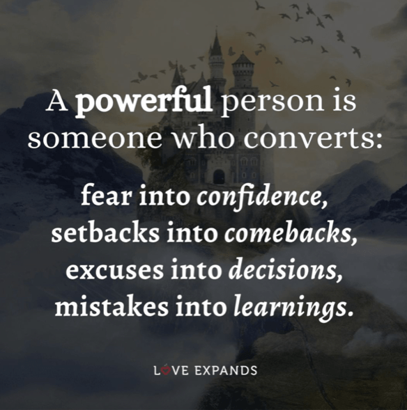 Fear into confidence, setbacks into comebacks, excuses into decisions, mistakes into learnings.