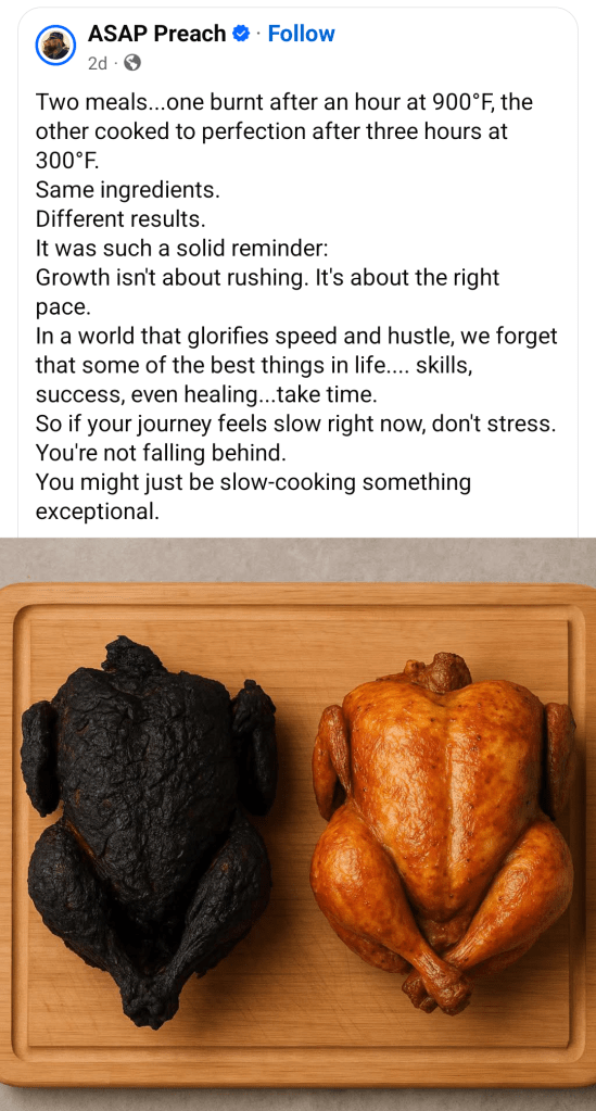 Too often, we treat growth like the high-heat oven: rush it, and we risk burning out, missing the richness of the process. But growth—whether it’s mastering a skill, building a business, or healing from past wounds—is rarely instant. It’s slow, deliberate, and requires patience.